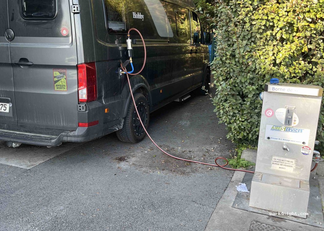 très bien,nuit calme,par contre certains camping-caristes qui viennent vider leur cassette sans prendre de l'eau (2 euros les 10mn de remplissage) essaye de récupérer de l'eau avec leur cassette sous le robinet d'eau propre, super l'hygiène.