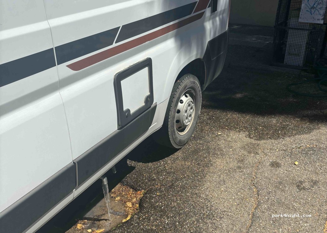 Parcheggio vicino a un parco. C'è un punto di servizio camper di fronte a un bar, chiedi le chiavi all'interno. Tavoli da picnic e giochi per bambini.