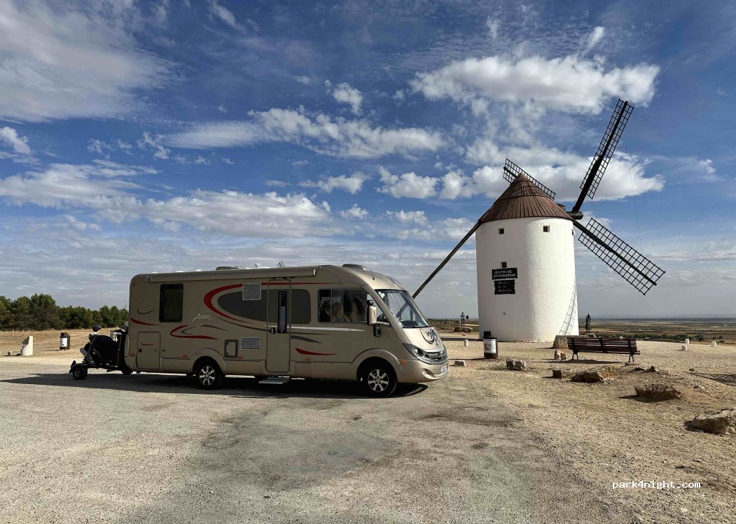 On the edge of the track with a 360 degree view of the surrounding countryside and especially of 6 magnificent windmills. Otherwise there is a lower car park, passing in front of the mills (one of which offers a small shop of local products...) very quiet out of season.