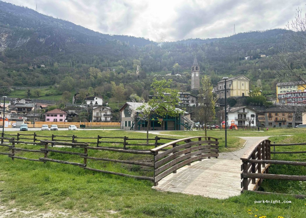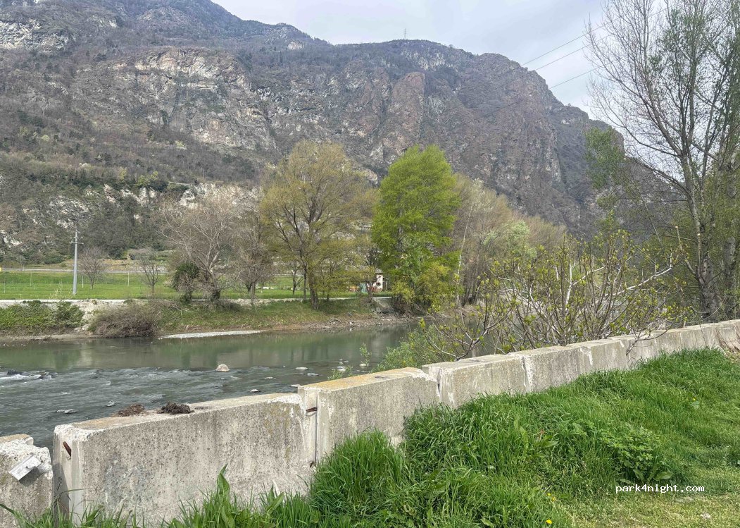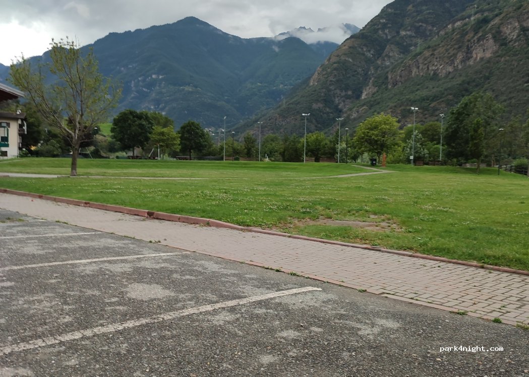 Parcheggio pianeggiante, piccolo parco e parco giochi a lato, fiume che scorre veloce e vicino al paese. Apparecchiatura che non è stata testata.