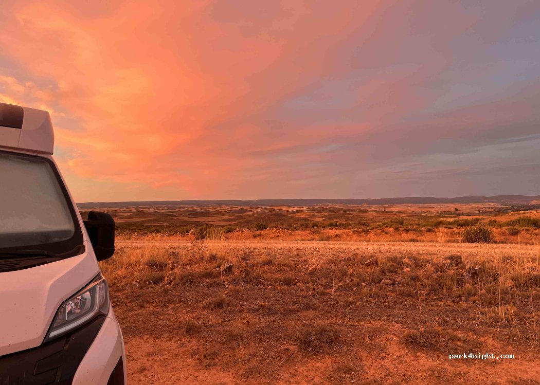 (Nuit du 03/09) Un magnifique spot en pleine nature pour passer la nuit ! Nous étions seuls et avons croisé seulement 1 tracteur le matin. Aucun service, accès poussiéreux mais très facile pour un gros van. Magnifique coucher de soleil sur la route en arrivant, et splendide lever de soleil au réveil ! Une super nuit !