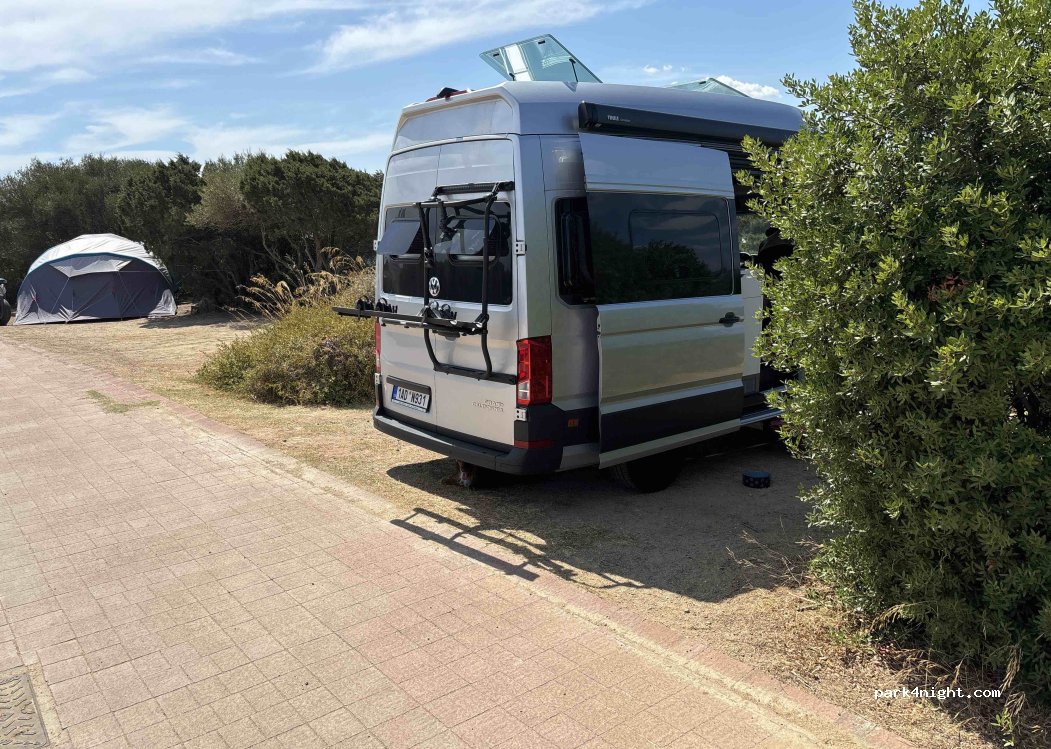 We had plans to stay for 2 nights , but left after 1 night... The pitches are so small, and everybody is close together Not really our cup of tea we payed 27 euro , 2 persons and a dog with the van. Porto pollo is really beatifull for kitesurf! Also the beachbars are nice places.
