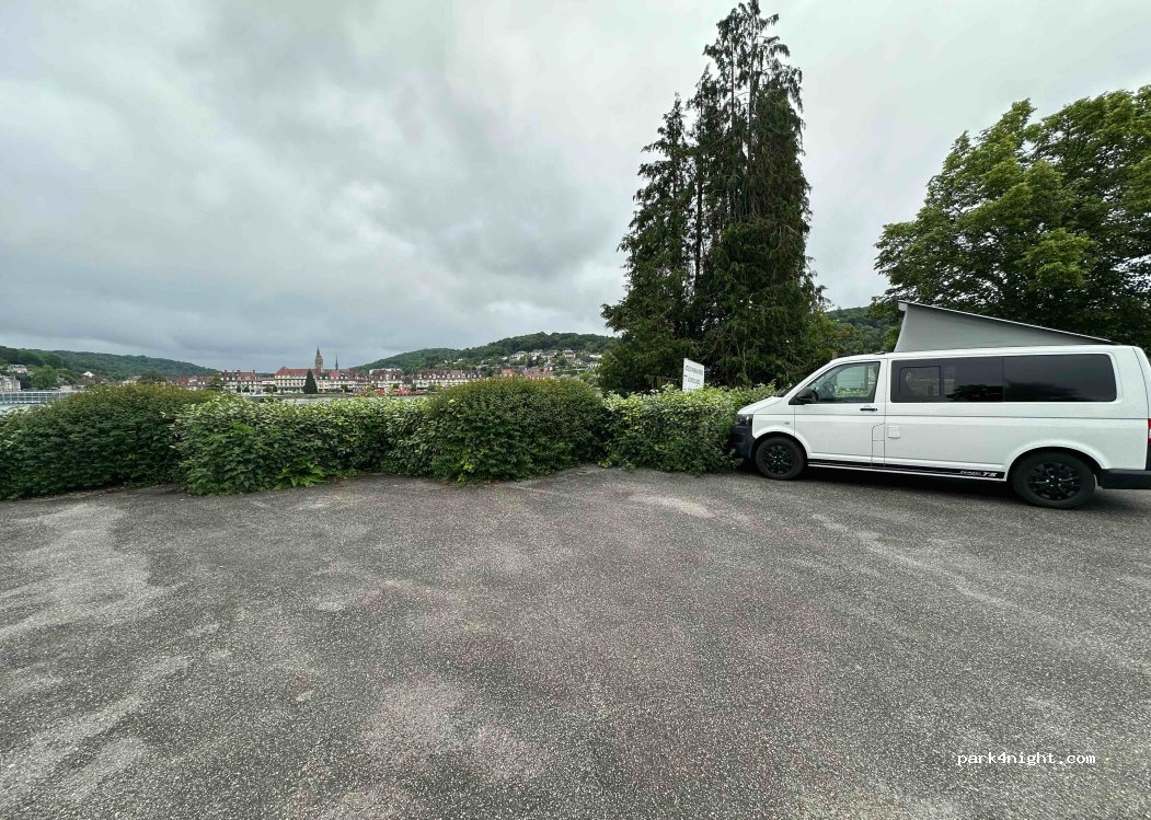 Small secluded campervan parking at the very end of a single track lane. Overlooking the River Seine and Claudebec town on the opposite bank. Services point was out of order. WiFi is first class. Very nice.