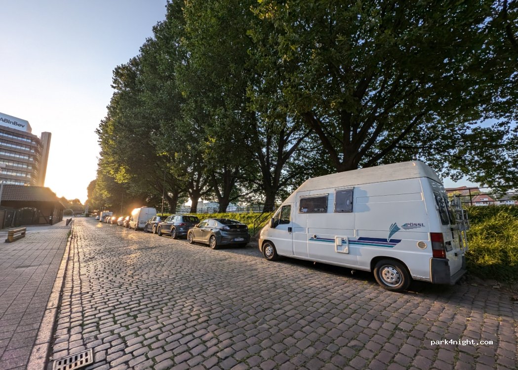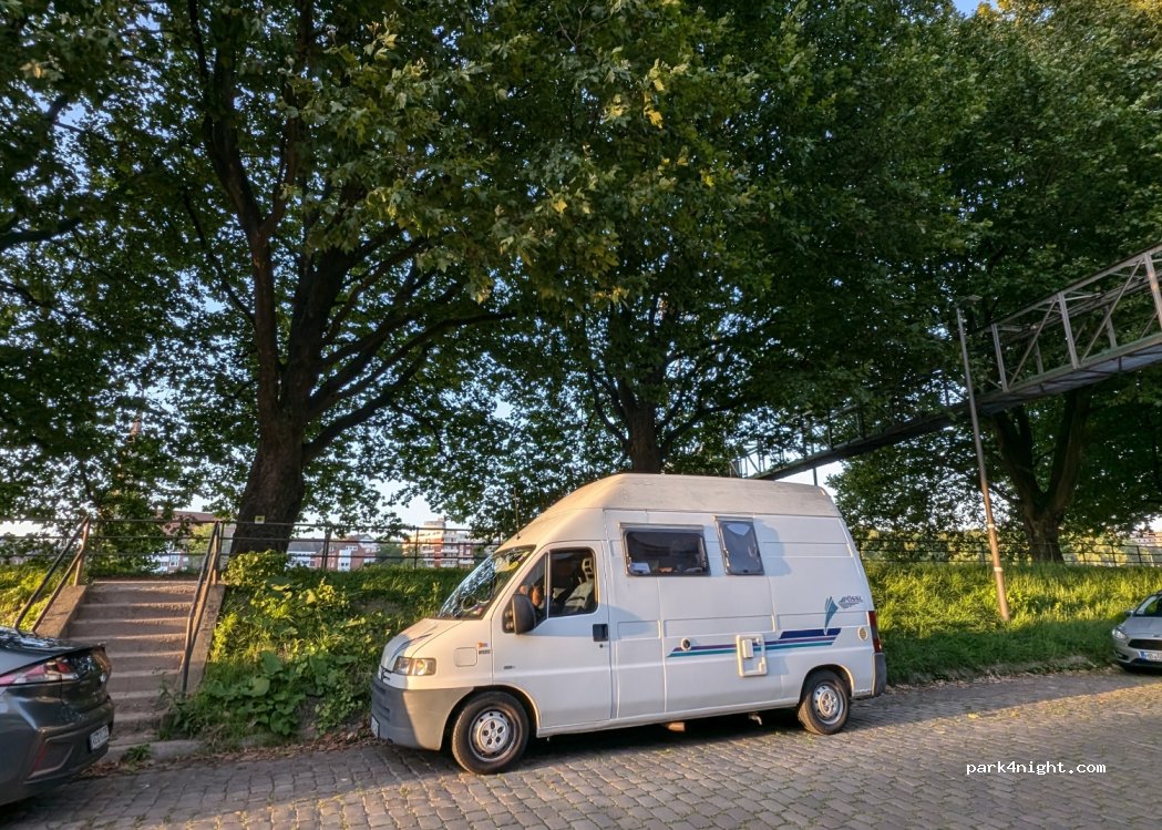 Pár minút od centra, stačí prejsť cez most. Keď sme tam v sobotu cez deň boli, ulica bola pokojná. Odporúčam zastaviť v strede ulice, medzi dvomi mostami, ak chcete zostať aj na noc (najtichšia časť). Na konci ulice je priestor na otočenie aj pre veľké karavany.