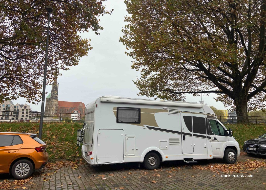 Cerca del centro de Bremen, aparcamiento con posibilidad de sombra, gratuito, tranquilo en la orilla del río. Está en zona verde (se necesita la etiqueta verde de bajas emisiones, ponen multa si ella).