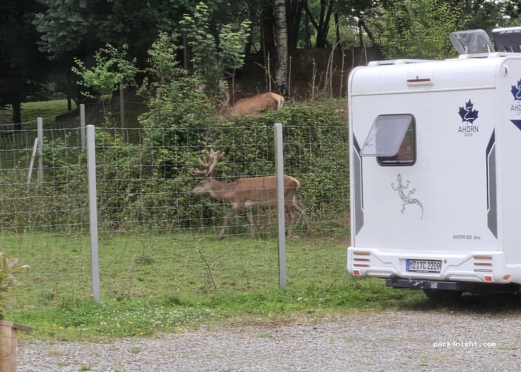 Schöner, kleiner Stellplatz. Dusche und WC vorhanden, Frischwasser kostenlos, Imbiss mit Biergarten, netter Betreiber. Und als Zugabe sieht man die Tiere des Wildparks, da der Zaun direkt am Stellplatz verläuft.Das