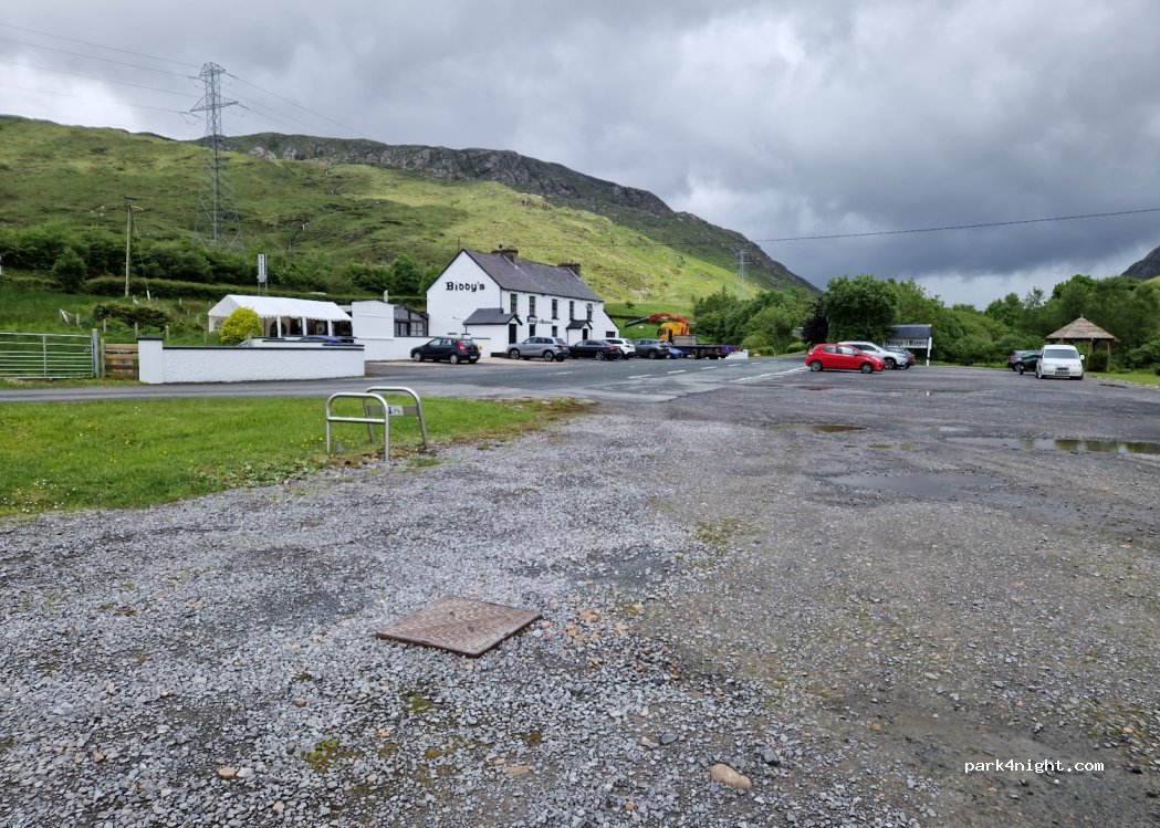 Car park of Biddy's O'Brian's bar is right on a stream in the valley. A little noisy from the traffic on the main road. Nice bar and friendly staff.
