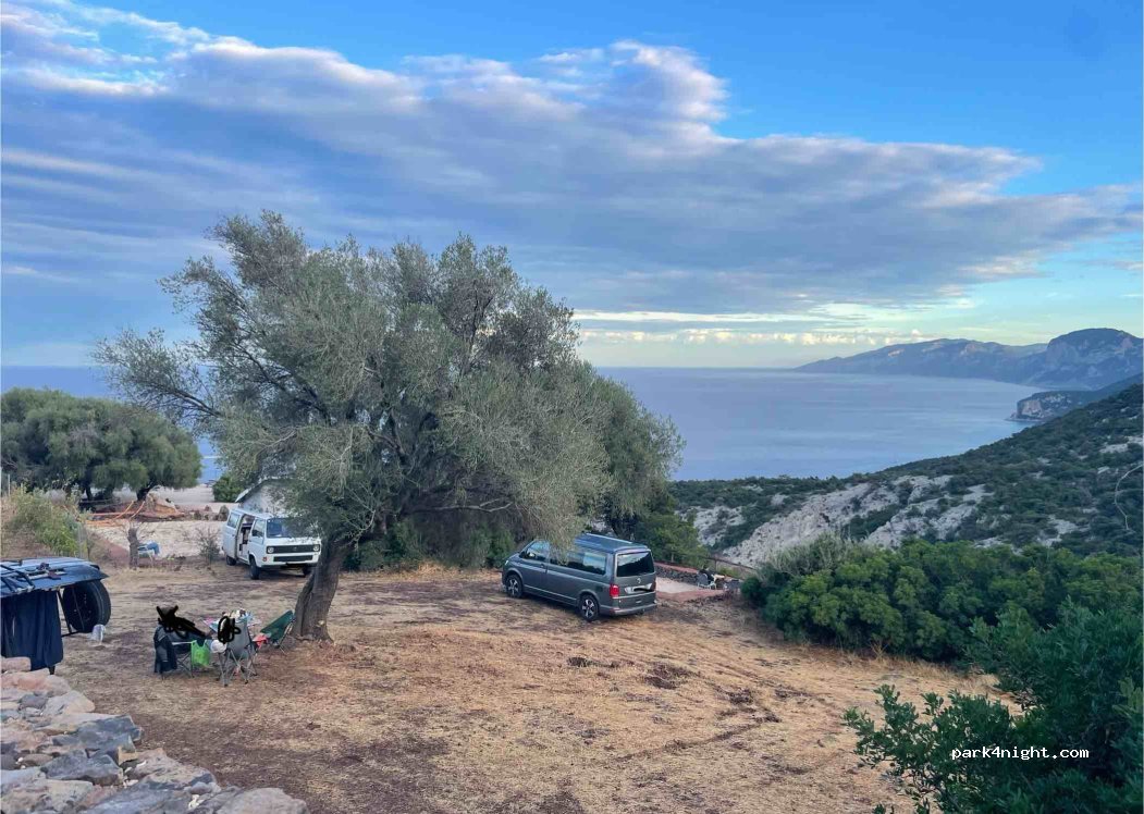 Sehr schöner Stellplatz mit besten Blick. Eine halbe Stunde zu Fuß einen steilen Weg runter zur Cala Luna. Sehr schönes Klettergebiet dort. Abends gibt es bei schönstem Ambiente mit tollem Blick ein Sardisches Menü mit selbst angebauten Produkten. 45€ pro Person inklusive Wasser und Wein, für die Riesen Menge die man bekommt absolut fair. Es gibt auch eine vegetarische Option.