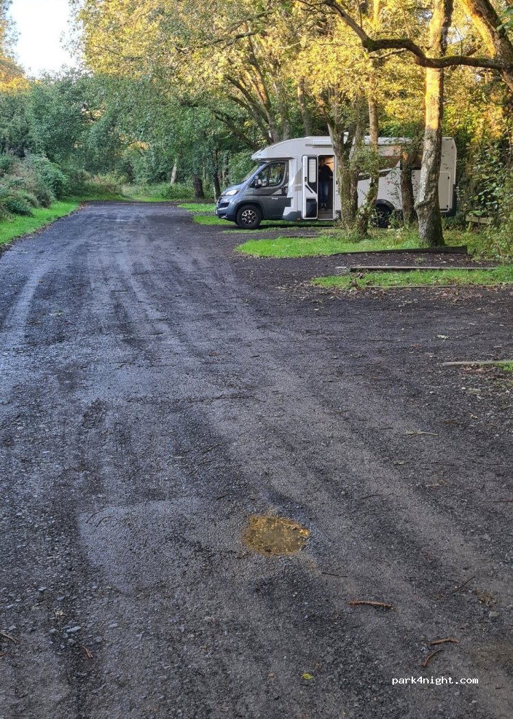 No facilities as to be expected - just a simple, quiet and peaceful place to park up. Minimal noise from the road nearby. Separated bays that are great for big vehicles, give a bit of privacy and frame your vehicle in trees.