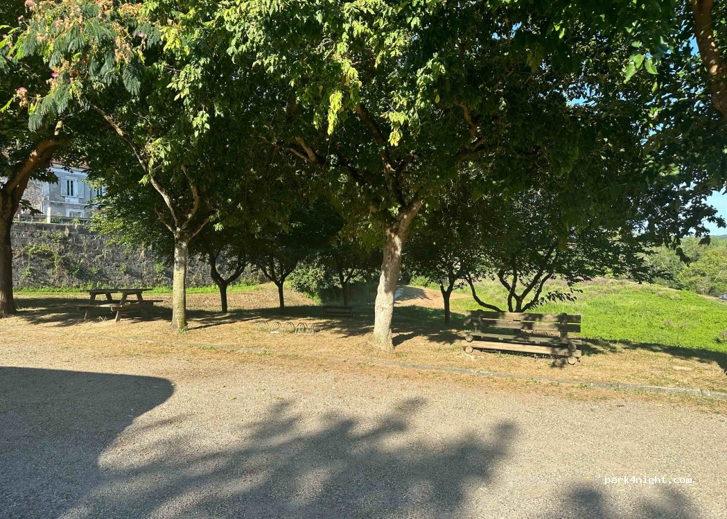 Beau site ombragé en bord de rivière. Un peu bruyant. Services gratuits : vidanges, toilettes publiques nettoyés tous les matins par un employé municipal qui se démène pour garder le lieu propre . Poubelles à 300 m devant le cimetière après le pont