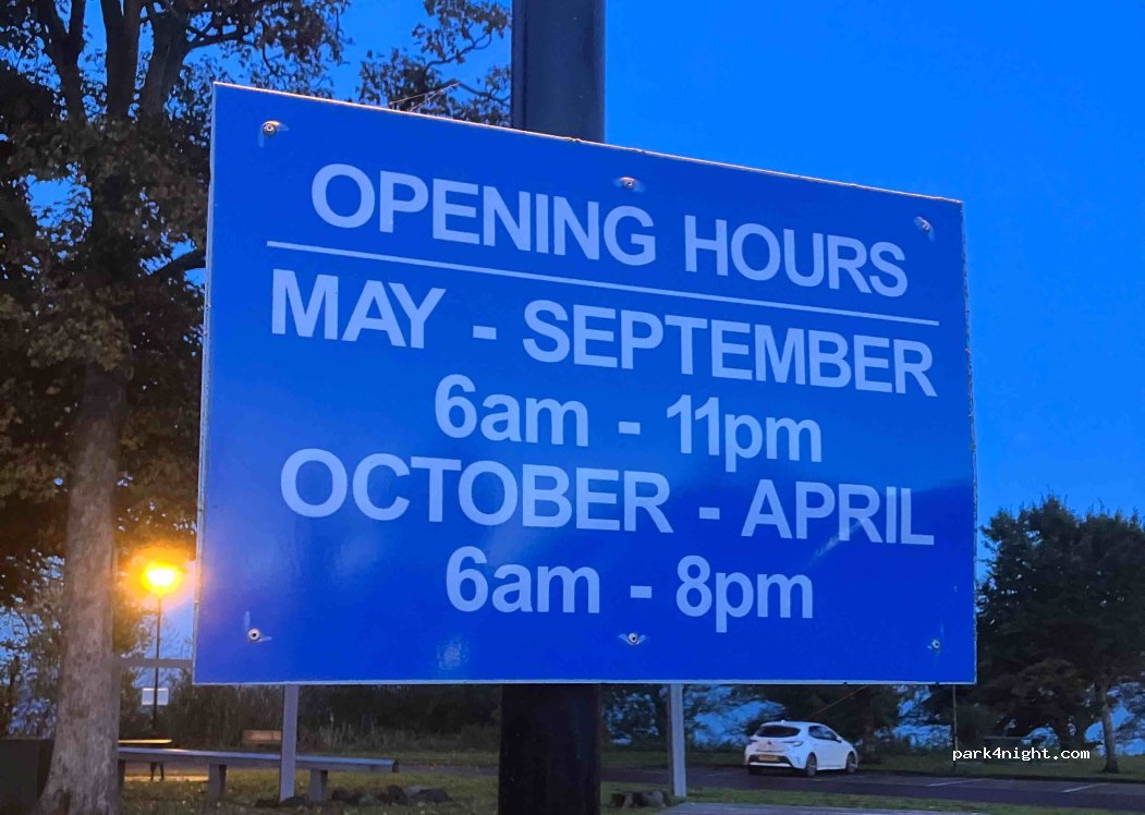 Park entrance gate will be closed after certain time (see photos) but reopens at 6am. Safe place to park up for for free, toilets, sea view, playground for kids, and loads of areas to walk and cycle