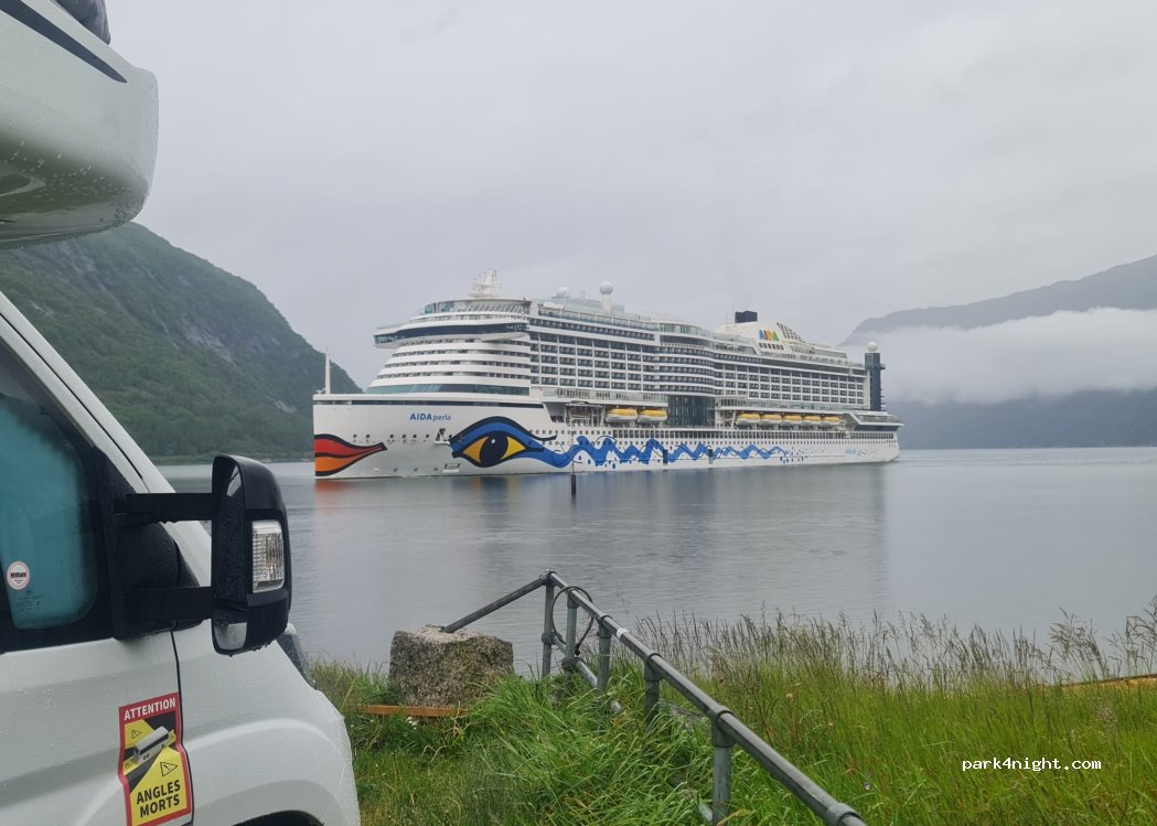 aire au bord du fjord.on peut-être bien placé si il n y pas trop de monde car chacun se gare ou il veut j'y suis resté 2 nuits, le fjord est magnifique. les installations sont anciennes, mais fonctionne. machine à laver et sèche linge en bon état, aire bruyante ,1 bateau de croisière accoste tous les matins vers 6h (faut aimer les bateaux). bruit de scooter des mers , d hydravion, de hors bord
