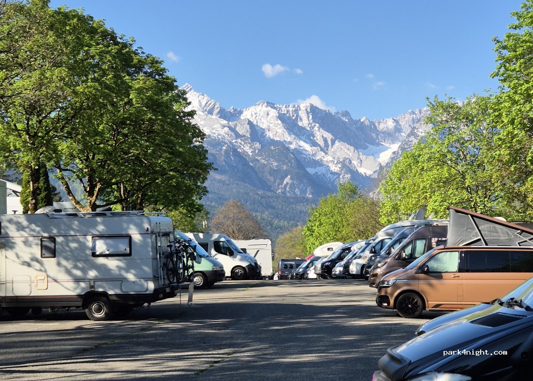 Voldoende ruimte en goed aangeduide slots op een hoger geleden deel van de kabelbaan parking. Je slaapt vlak aan de kabelbaan dus ideaal als uitgangspunt voor dagtochten. Op 25 minuten rijden van de zugspitze en eibsee. Wij bleven er 2 nachten en betaalden 20€ per nacht. Je krijgt hiervoor ook de code naar de douches (1€ voor een ruime tijd aan warm water) en een ticket voor de aanliggende kabelbaan) ook vanaf de parking kan je rechtstreeks het bos in. Winkels dicht in de buurt en alle voorzieningen kunnen gelost en gevuld worden. Top plek.