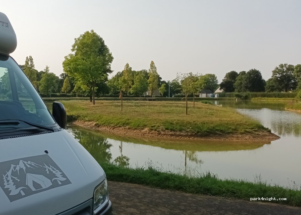 Aire très sympa au bord d un étang calme et spacieuse Sanitaires publics propres ! Bel effort de ce petit village Merci pour les camping caristes