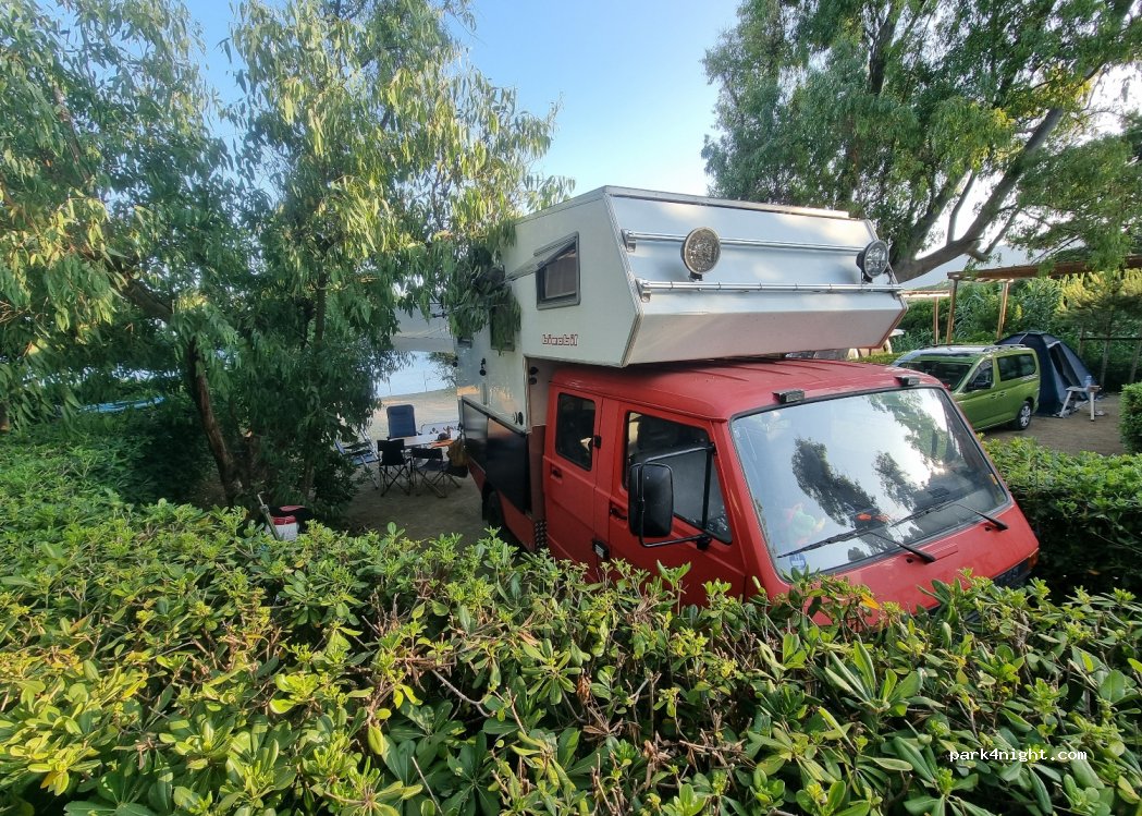 El camping se llama La Riccia. Excelente terraza para acampar y sombra. A sólo unos metros del mar. Los dueños fueron muy amables. Instalaciones sanitarias perfectas. Parcelas de terreno lo suficientemente grandes y algunas bien demarcadas. De difícil acceso para autocaravanas de más de 6…7 m. Algunas localidades con vistas al mar y otras resguardadas del viento.