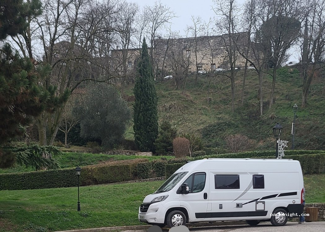 Parking de la salle des fêtes. donc attention les week-ends, terrain de foot et de basket à côté, camion à pizzas le jeudi soir de l'autre côté de la salle. WC et eau dans le village à 150 m