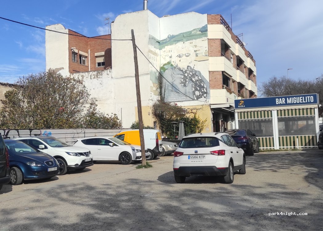 Parquing de tierra, con basuras varias por el suelo. Allí hicimos noche con furgo pequeña, nadie pidió nada ni vimos gente que pidiera. Nos quedamos allí, porque había un bar abierto hasta las 00:00, con gente tomando copas fuera. Hay una carretera transitada al lado, pero la verdad que de noche bien, pudimos dormir bien!!! A 5 min andando hasta el puente Romano.