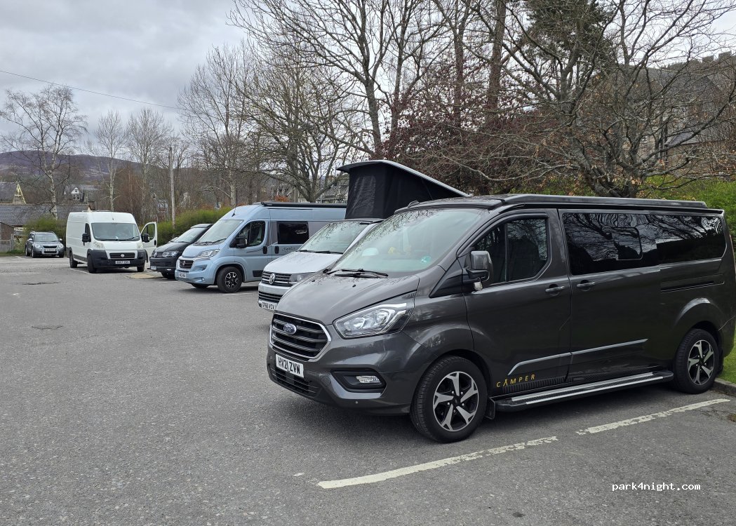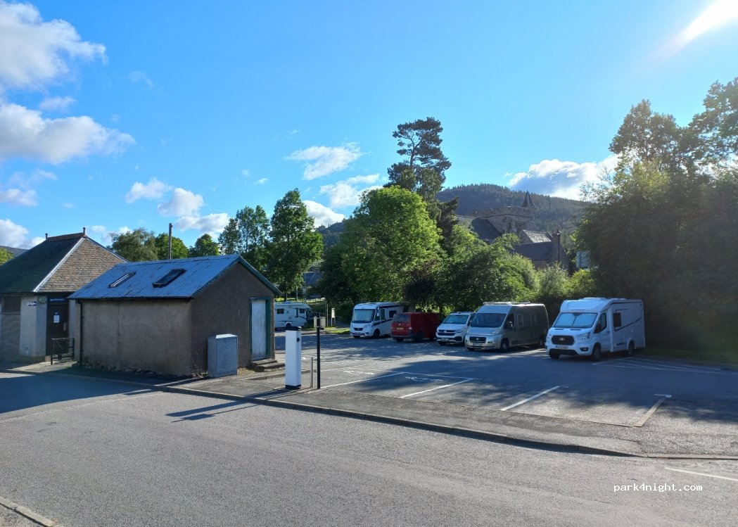 Great spot, such a lovely village, friendly people. Stayed 1 night with about 10 vans. Free parking. Car park is not big, vans bigger than 6 metres would struggle, and very busy during the day. Public toilets open 8am-8pm, bins, tap. Close to hikes (Morrone hill), Pubs (Farquharson's Bar, Fife Arms), Co-op supermarket, butchers, takeaway etc.