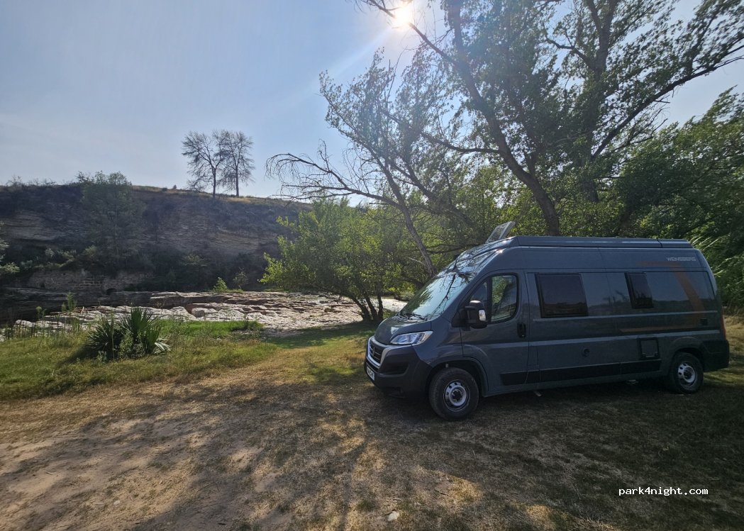 Pasamos dos noches aquí, no hay mucha sombra pero el lugar es magnífico. Durante el día gente paseando, bañándose en el río o pescando. Por la noche tranquilidad abdoluta. El acceso con furgo 4x4 de 6m sin problema ninguno, para autocaravanas grandes no sé yo...