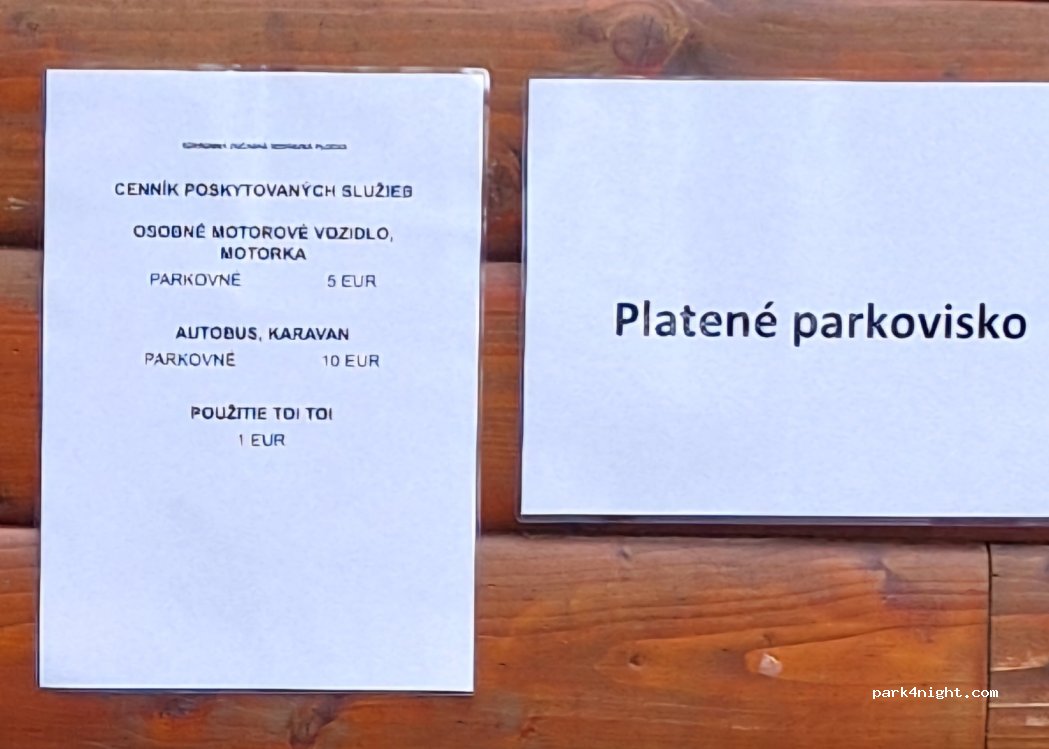 At the moment (end of June) price for parking is 20 Eur. There is no overnight parking price for mobile homes, for the 20 Eur you can park day+night. PS. Whatever you do, do not enter the Topky pension road (behind the gate) and do not park anywhere on the other side of the lake. A guy from the pension is not very tolerant. To him, parking with a mobile home is considered camping.