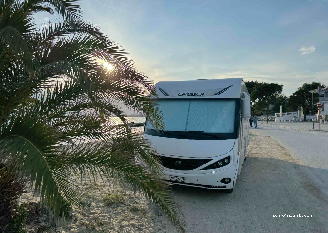Free parking directly on the sea, unfortunately no showers available but many restaurants and bars.