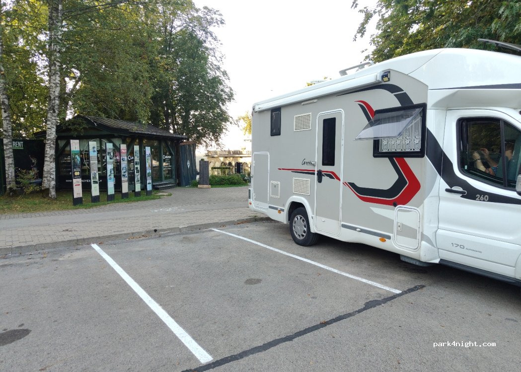 We asked in the shop and told fine to park overnight. Great spot in a beautiful place with stunning sunsets. 10 min walk to the castle (fab ice cream and nice pottery shop). 2 hr pretty round trip hike to Turaida Castle via the cave and back along the river (if you exit the castle from the steps in the sculpture park). There's also bobsleigh, toboggon, bungee from the cable car & lots more to do.
