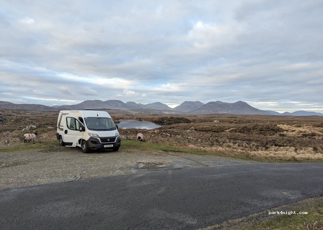 Le connemara comme on l'imagine. Spot légèrement en hauteur ce qui donne une vue assez panoramique, sur les lacs et sur les montagnes. Spot plat, 2 emplacements bord de la  petite route ( peu de circulation). L'emplacement par lui même n'est pas fun fun, mais le paysage alentour fait oublier ce petit défaut. Comme souvent ici  pas super clean, on ramassera demain avant de partir. Nuit calme.
