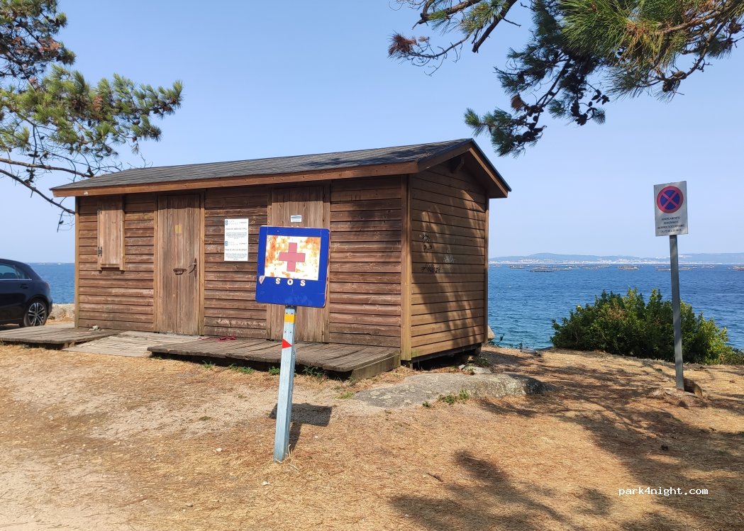 el sitio es precioso. nadie nos dijo nada por pernoctar alli, a lo largo del camino que discurre a pie de playa habia otras furgonetas. hay baños en el puesto de socorristas que cierran por las noches