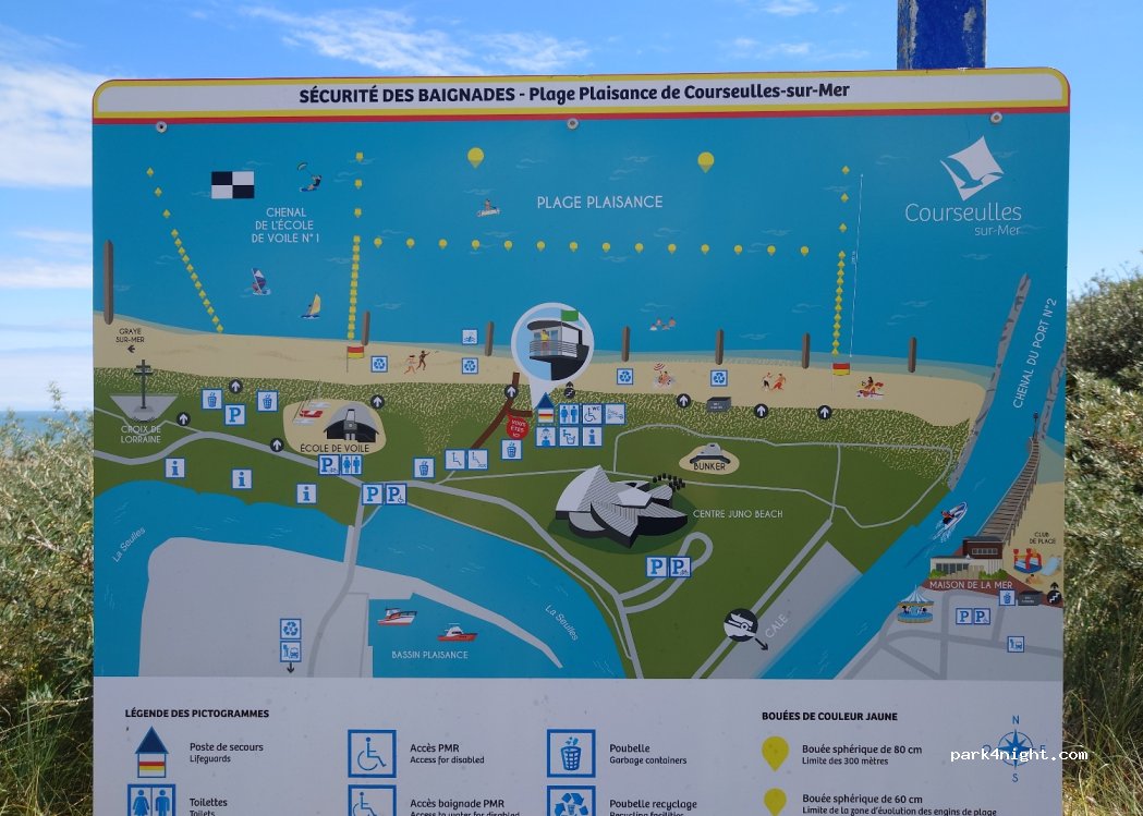 Parking avec barrière de 2 mètres (mais c'est plutôt 2,2m), donc accessible uniquement aux voitures non surélevées. L'entrée se fait devant les places de parking CC. Directement sur la plage avec une vue imprenable sur la mer et calme la nuit. A noter que les journées venteuses sont la référence pour les véliplanchistes. Faites donc attention à ne pas les déranger avec trop d'espace. Poubelles sur place. A proximité (100 m) se trouve le Musée canadien de Juno Beach (Mémorial du Débarquement). A 800 mètres du centre ville et de ses commerces. Il y a des toilettes publiques à côté dans l'école de voile et quelques mètres plus loin dans la maison du sauveteur il y a des douches publiques (donc froides, dehors sans protection)