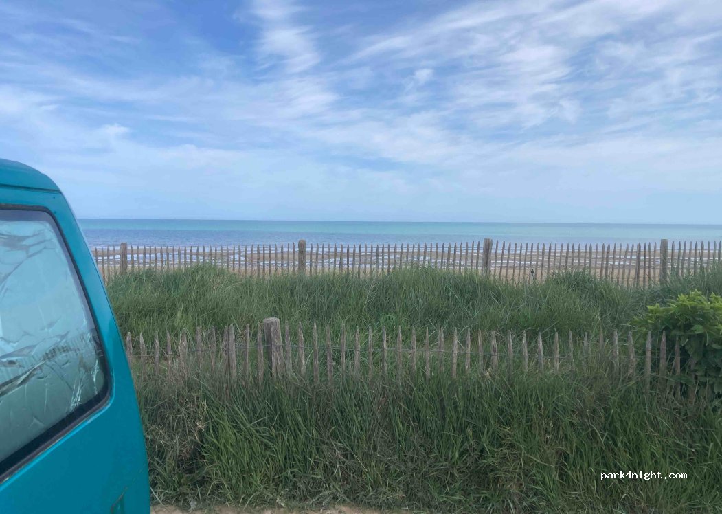 Parking with barrier 2 meters (but it's more like 2.2m), so only accessible for non-raised cars. The entrance is in front of the CC parking spaces. Right on the beach with a breathtaking sea view and quiet at night. Note that the windy days are the benchmark for windsurfers, so be careful not to disturb them by taking up too much space. Garbage cans on site. Nearby (100m) is the Canadian Museum of Juno Beach (D-Day Memorial). 800 meters from the city center and its shops. Next door in the sailing school there are public toilets and a few meters further in the lifeguard's house there are public showers (extremely cold, outside with no protection)