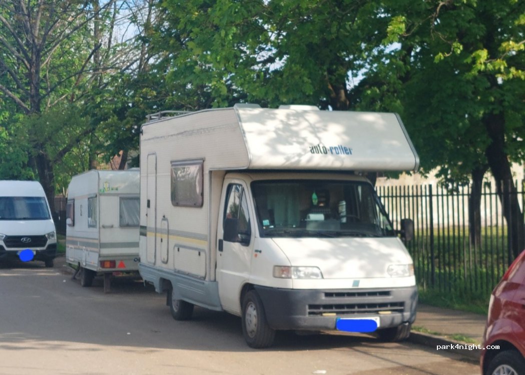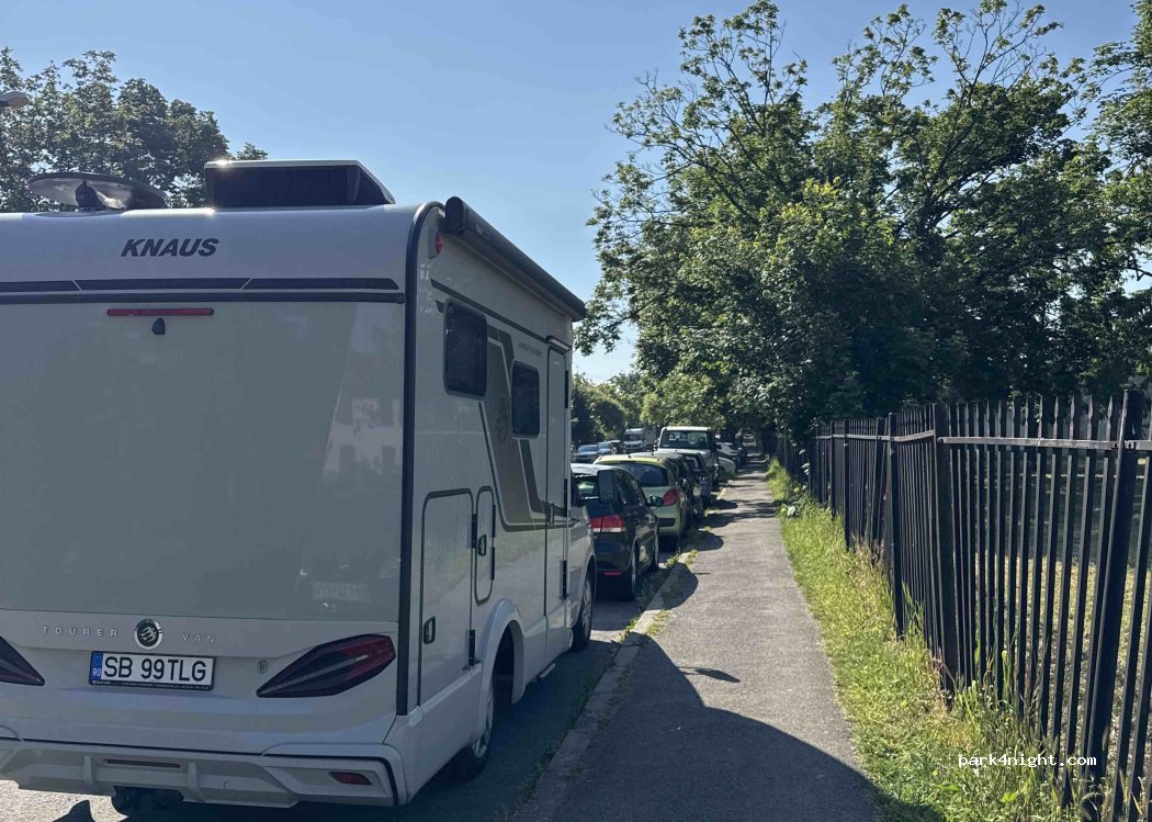 Parking clôturé et gratuit à partager avec les voitures, accessible à tous les gabarits, globalement stabilisé et de niveau. Le portail est fermé de 22h à 07h. Contiguë à la citadelle l'endroit est calme et agréable. Aucun service mais 4G optimale. Les places du fond sont bien ombragées et sur herbe. Ce stationnement est une excellente opportunité pour visiter le beau centre ville d'Oradea.