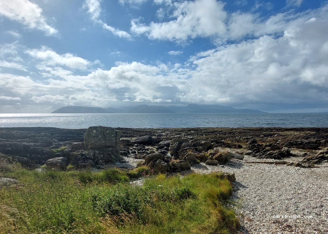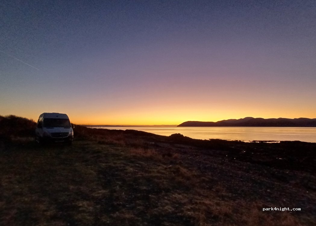 Absolutely perfect park up. Little pull ins all along the road with access to the beach. We stayed on the one with a bench and small sandy/ rock beach. stunning views, very peaceful. No services but toilets at the ferry port up the road.