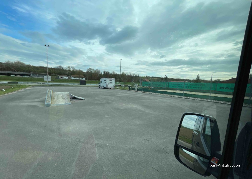 Endroit gratuit. Un côté en dur, sans doute pour les vans et camping car, et un carré d herbe plat. Il y a un terrain de beach volley. Des bancs et poubelles. Il y a bien un robinet mais l eau est blanche... En face grand terrain de foot. Route peu passante.