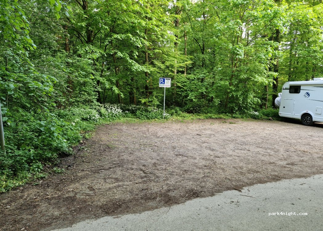 Kleiner Parkplatz mitten im Wald. Leicht abschüssig. Sehr gute Strasse. Auch grössere Camper möglich.