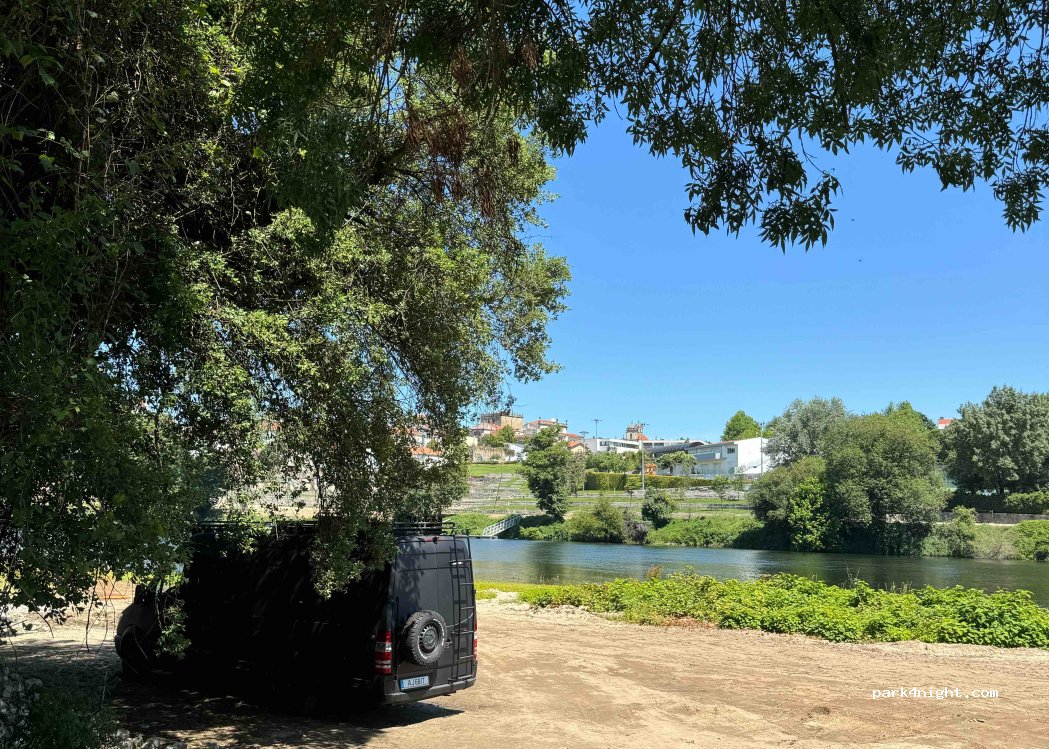 Llegamos de noche. En la otra punta hay un bar, con lo que había varios coches, pero bastante tranquilos. A las 22.30 ya solo estábamos nosotros y otra furgo. Noche muy tranquila escuchando el río. Playa fluvial bonita, que se tiene que llenar en días soleados. Se puede ir a visitar la ciudad andando.