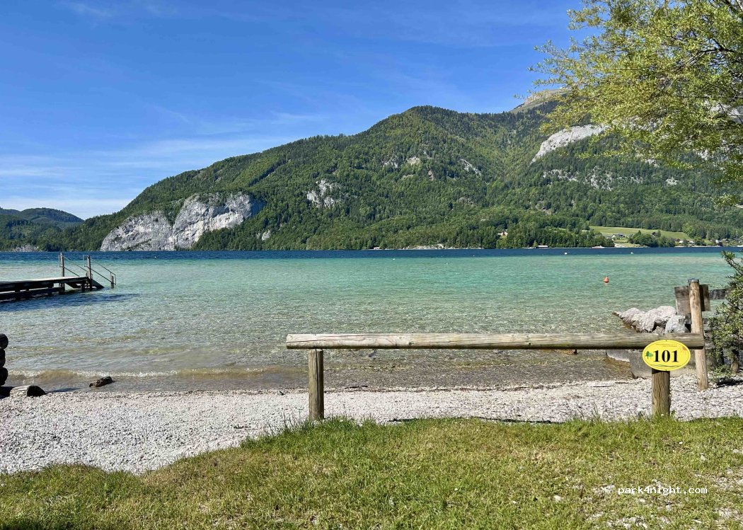 Velký kemp na břehu jezera Wolfgangsee, čisté moderní toalety a sprchy. Vstup do sprch na kempovou kartu s omezením 7min/osoba/noc. Nemožnost platit kartou, pouze cash, bereme jako velké minus. K dispozici malé oplocené dětské hřiště.