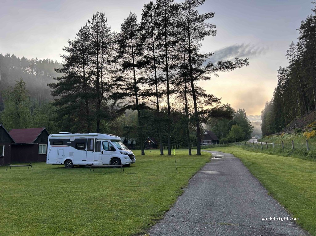 Quite an expensive one: paid 420CZK (16.5EUR) for one night: 90CZK (3.5EUR) per person 150CZK (6EUR) for a van 50CZK (2EUR) for a dog tax 20CZK. Shower is "per coin" - 20CZK per coin. (we didn't use it) It's located right next to the road and a local railway. during the day you'll get a lot of cases and motorcycles with some small local trains. But overall it's a nice place to stay.