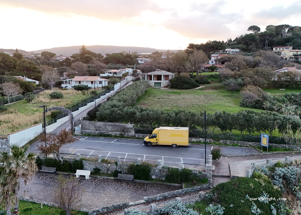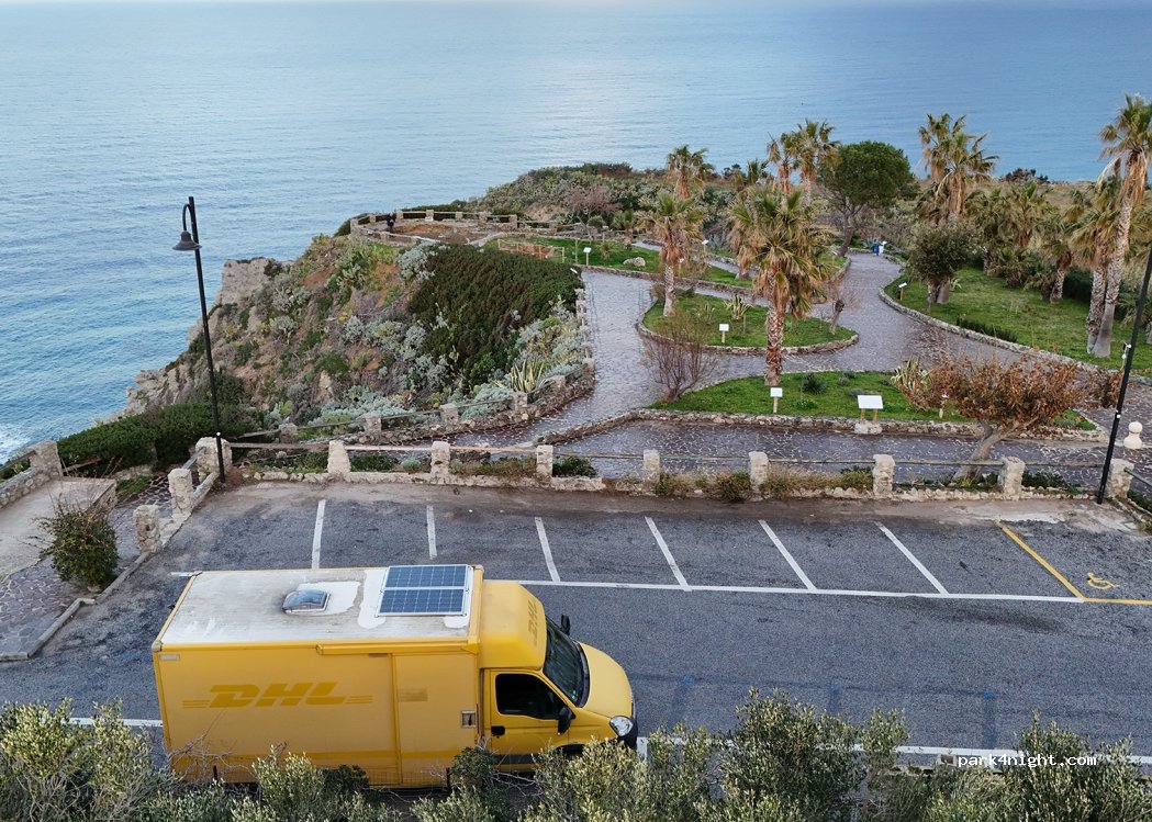 Parking at Pardo Belvedere with a beautiful view of the Stromboli volcano. Some people at sunset, but then completely empty. No garbage, very tidy and quiet. Here stood a quiet night! Parking spaces are dimensioned for normal cars, there is plenty of space after sunset, but before that it is more recommended for smaller vans.