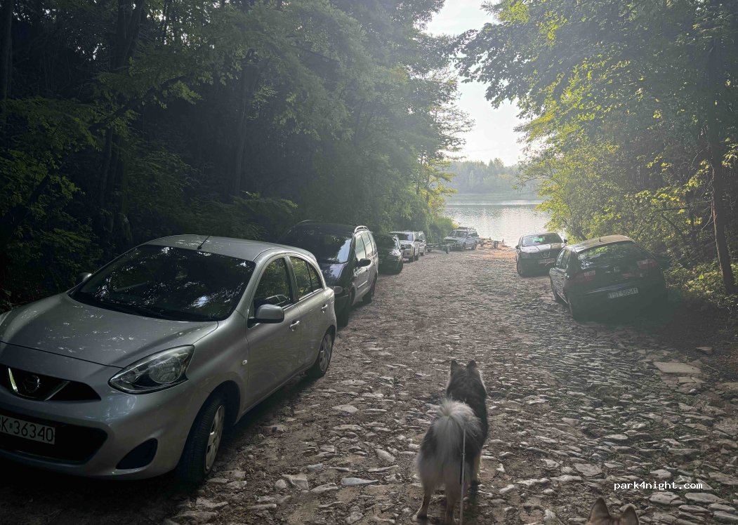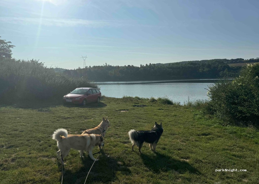 Bardzo ładne miejsce z pięknym widokiem za Łysą Górę i jezioro. W weekendy wieczorami spory ruch miejscowych, a nad ranem wędkarzy wodujących łódki. Dla spokoju lepiej zatrzymać się 200m wcześniej. Woda w jeziorze czysta (uwaga, przy wysokim stanie bardzo szybko robi się głęboko).