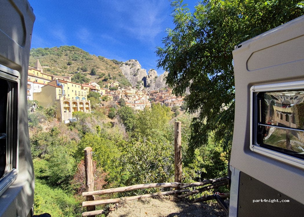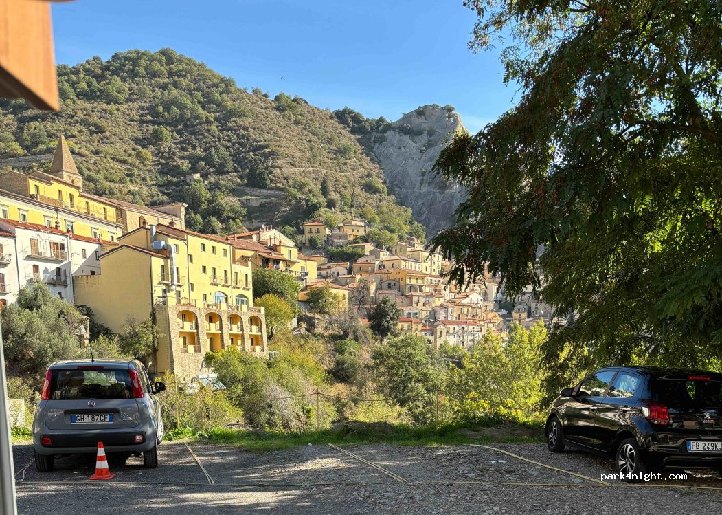 Es ist der Privatparkplatz des Quad Discovery Dolomiti Lucane-Verleihs, der gegen Gebühr eine von 20 Euro Übernachtungsmöglichkeit mit Stromanschluss und WLAN anbietet. Nachts sehr ruhig und die Aussicht auf Castelmezzano ist echt toll. In die Ortschaft sind es 5 Minuten zu Fuß.