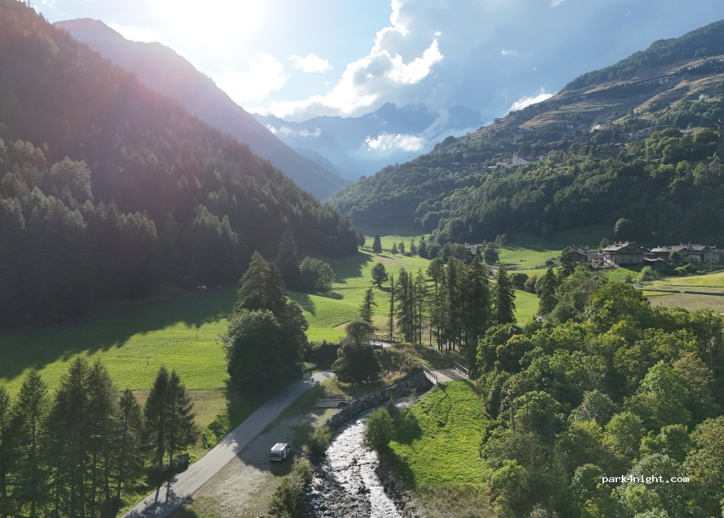 parcheggio su prato, in piano molto bello, passata una notte tranquilla a 30 minuti circa dal paese paese di Etroubles.