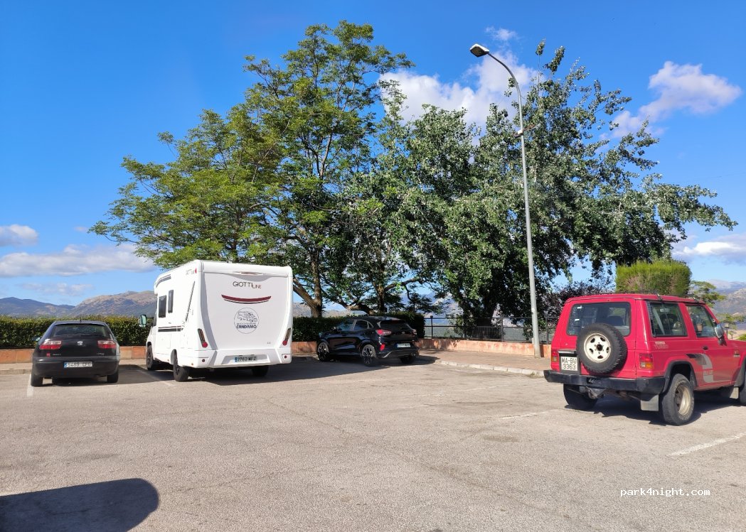 Hemos hecho noche en este parking sin ningún problema, caminando hasta el centro 10 minutos, las vistas son muy bonitas, no hay sombra. La policía pasa a menudo y si no tienes sillas, mesas... fuera no te dicen nada.