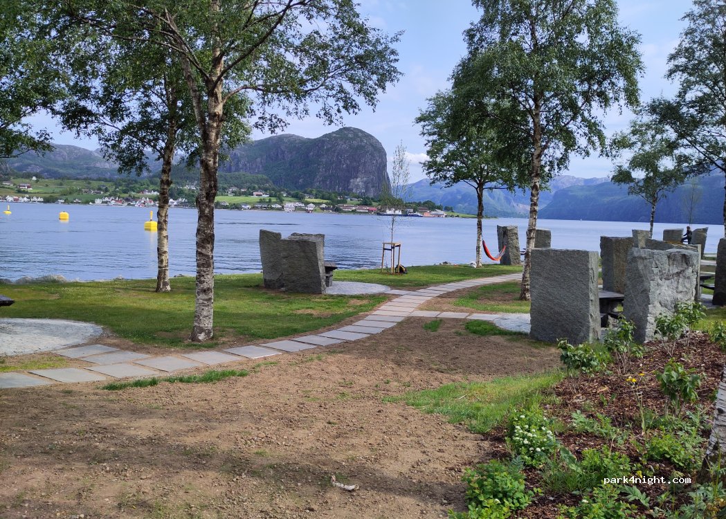 Es un Área de Descanso a 500m del puerto de salida de los ferrys a Lauvvik. Está cerca de la carretera y se oye un poco de ruido, pero la vista a la ría es espectacular. Bien arbolado e ideal para pasar la noche. No hay muchas plazas (de 10 a 15) y tampoco hay servicios para autocaravanas.