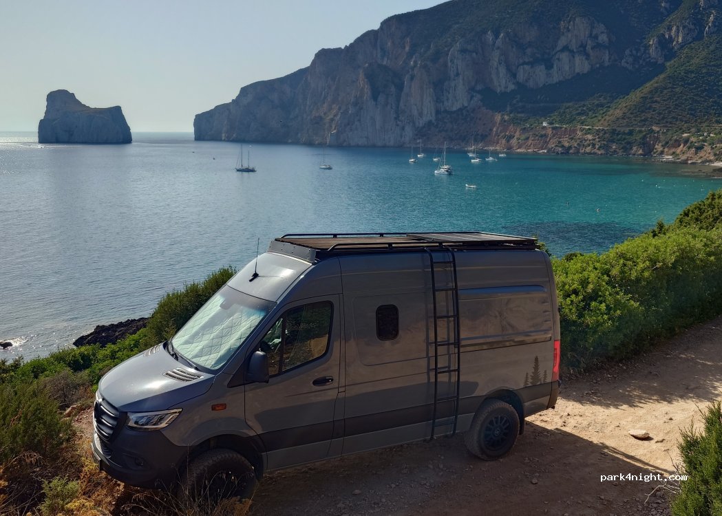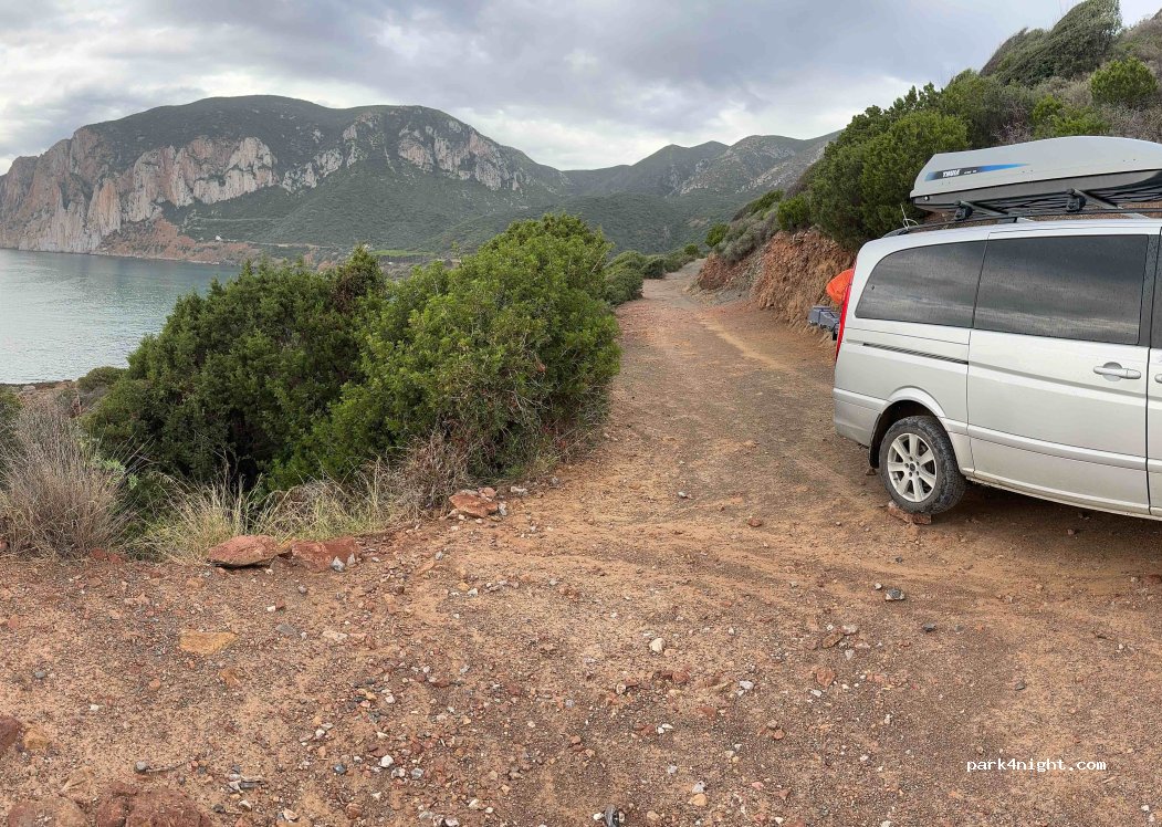 Flat place at the end of gravel road. Very nice place with a view on Porto Flavia and pan di zucchero. Very peaceful and quiet. In the early morning some fishermans arrive. The road is bumpy only at the beggining (4x4 reccomended), than the road is fine. Not for large vehicles.