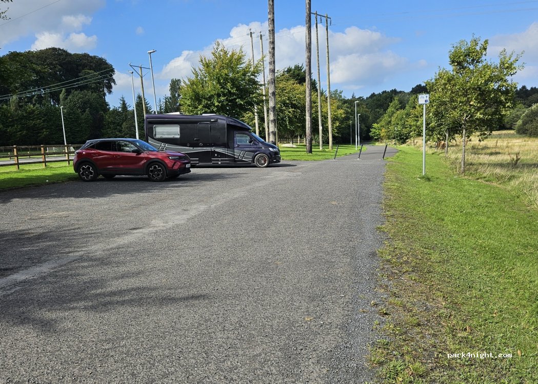 Nice spot but you do feel a bit exposed its right next too a football pitch and it was very busy with football training on when we arrived all quietened down at 19:30 and then its just walkers runners after that. The walk through the woodland is beautiful and shouldnt be missed. We stopped for 1night but id say its worth stopping just to do the walk if you didnt want to stay.
