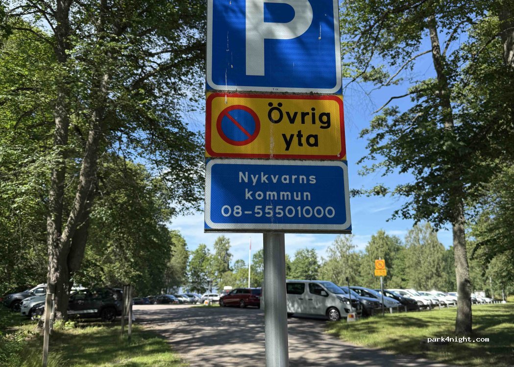 This is a 24-hour parking with no restrictions shown by the blue P-sign at the entrance. The yellow sign says ”No parking on other areas” (övrig yta).