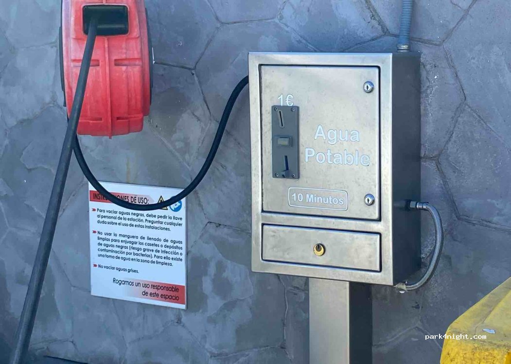 1€ pour 10 minutes d’eau potable. On peut vider les eaux noires gratuitement. Il faut demander la clé à l’intérieur. Ils ont aussi des toilettes et un mini market.