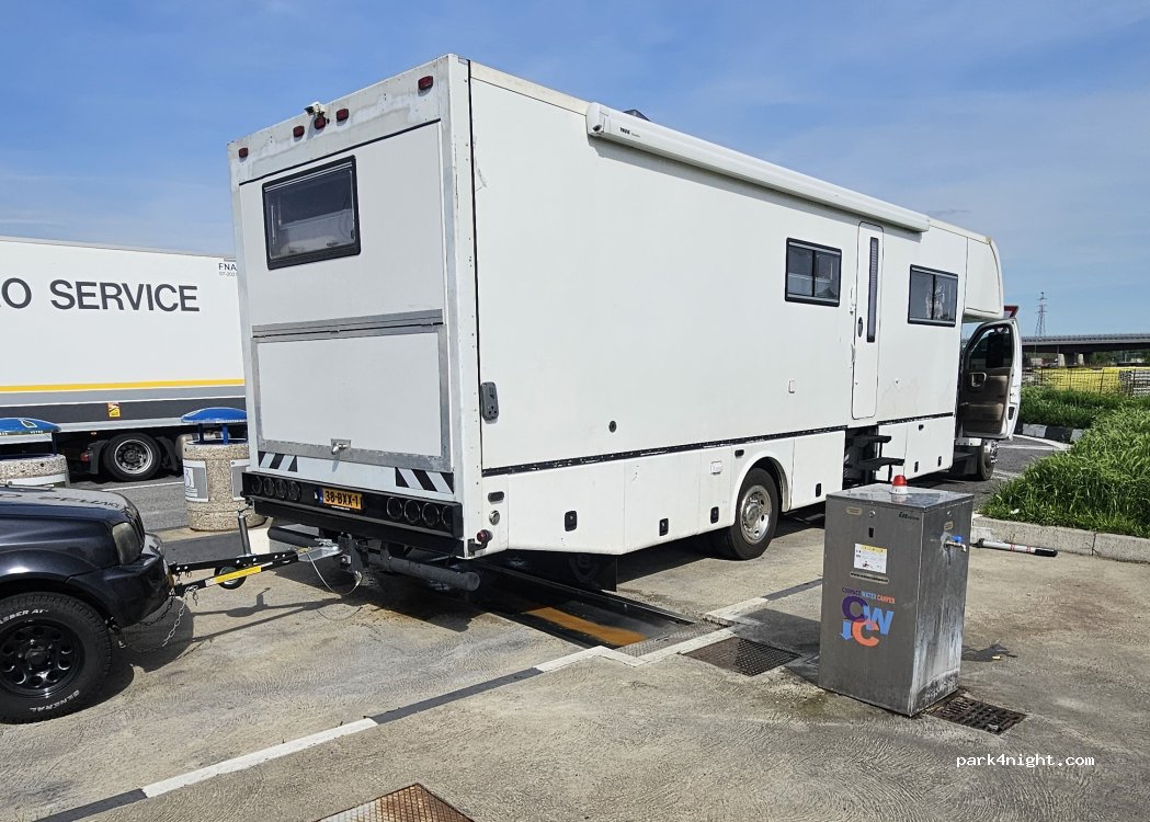 Black and gray water discharge, with the possibility of water (not drinkable I think). Store available for water. Ok for classic drainage. Located in the motorway rest area. Free toilet and shower.