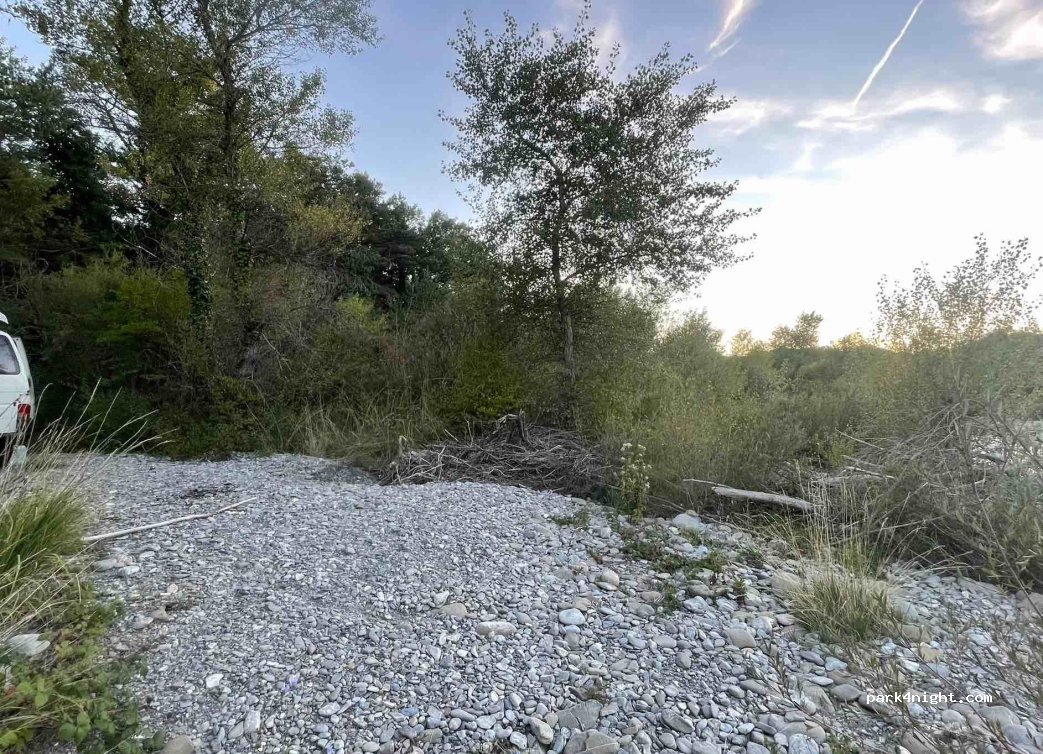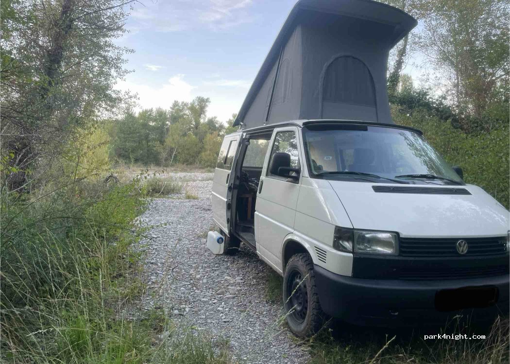 Not for LWB vans or motorhomes. Small entrance on a bend. Good spot for a small Campervan like a VW T4 to get to but the small gravel road is getting a bit tricky to get back out of as it’s made of rocks and quite steep so may appear scarier than it is at first. Was reluctant in my high top VW T3 but I have a limited slip diff so no issue. Next to a road. On the river which is very beautiful.