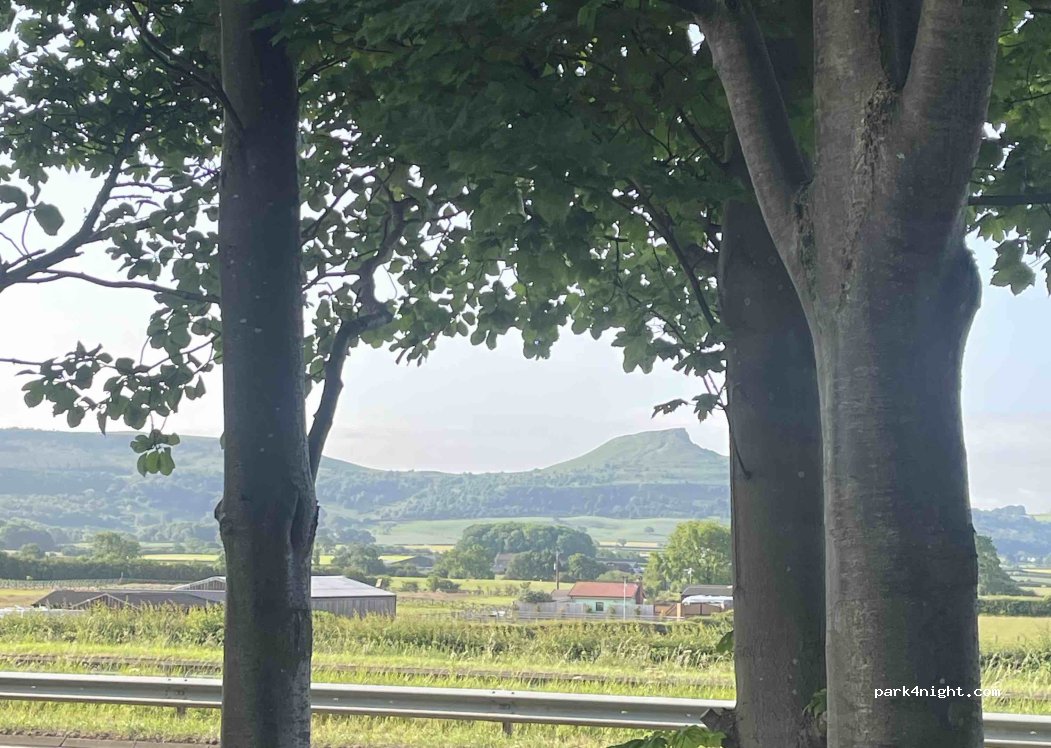 A set back lay-by, nearby road not too busy over night, lay-by is quite narrow in some parts wouldn’t like to be in too big a motor home. Only a bin no other facilities. Reasonable phone signal and short drive to Guisborough for public toilets and shops. Views across to Roseberry topping